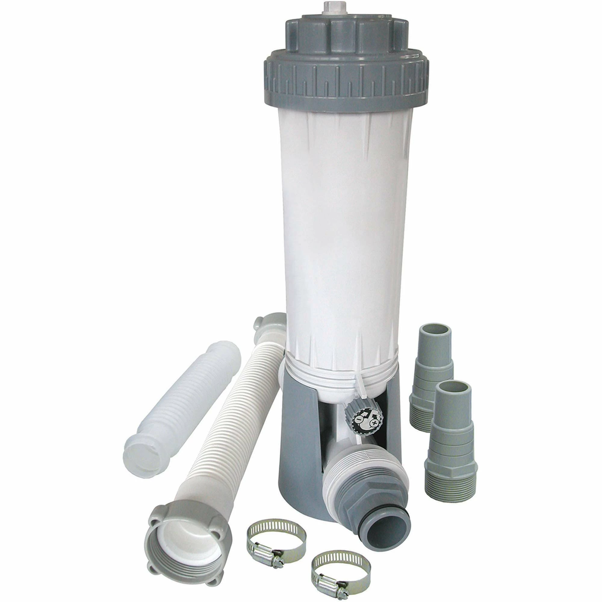 Die Chlor-Dosierschleuse ist ein sogenannter Auflösungsbehälter für Chlortabletten zur ständigen Dosierung. Passend für alle handelsüblichen 200 Gramm Tabletten. Die Dosierschleusse kann einfach in den Filterkreislauf integriert werden, beidseitig 38 mm Schlauchanschluss.