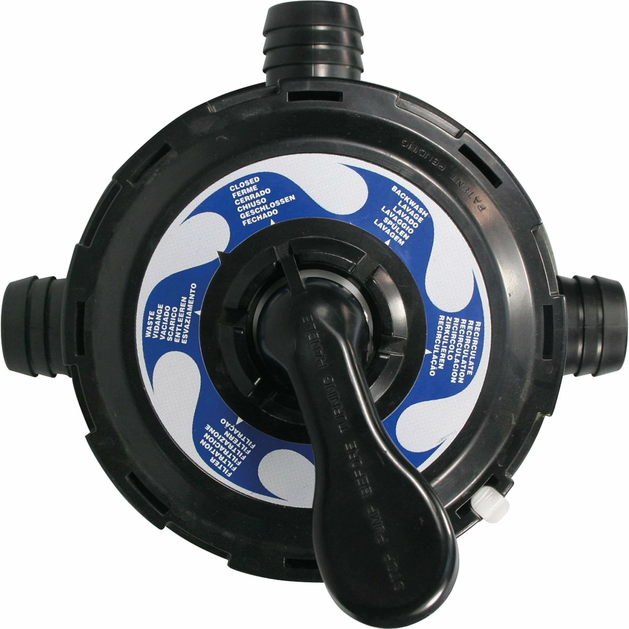 - 6-Wege-Ventil mit 38 mm Anschlüßen (Funktionen: Filtern, Rückspülen, Nachspülen, Entleeren, Zirkulieren, Geschlossen)
