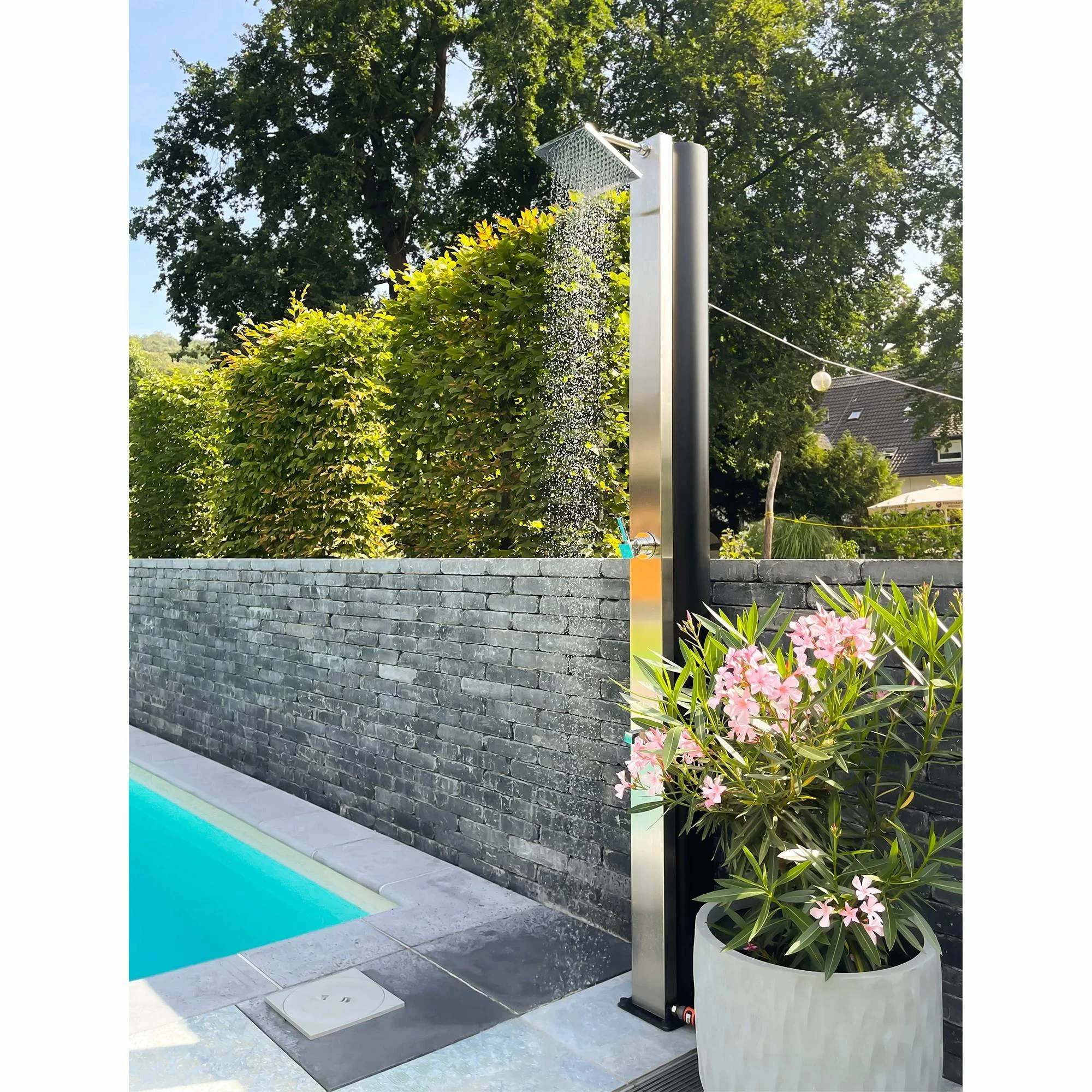 Durch das zeitlose, schlichte Design lässt sich die Dusche in jeden Garten ideal integrieren. Der große moderne Regenduschkopf sowie der praktische Fußwascher machen Ihr Duscherlebnis perfekt. Durch die praktische Höhe von 220cm ist die Dusche auch ideal für größere Personen geeignet.