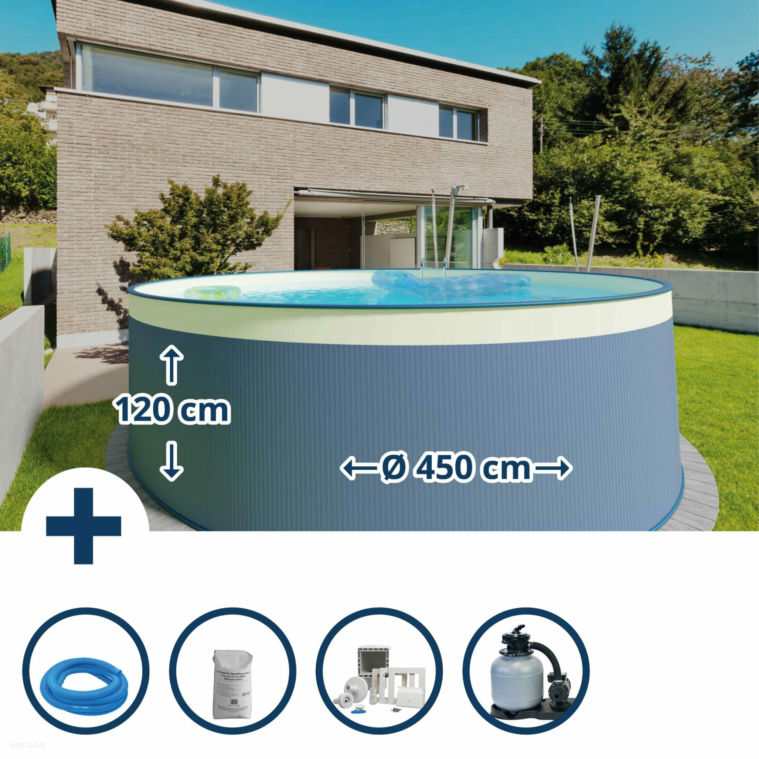 Dieser Rundformpool hat die Maße 450 x 120 cm und die Außenfarbe anthrazit.