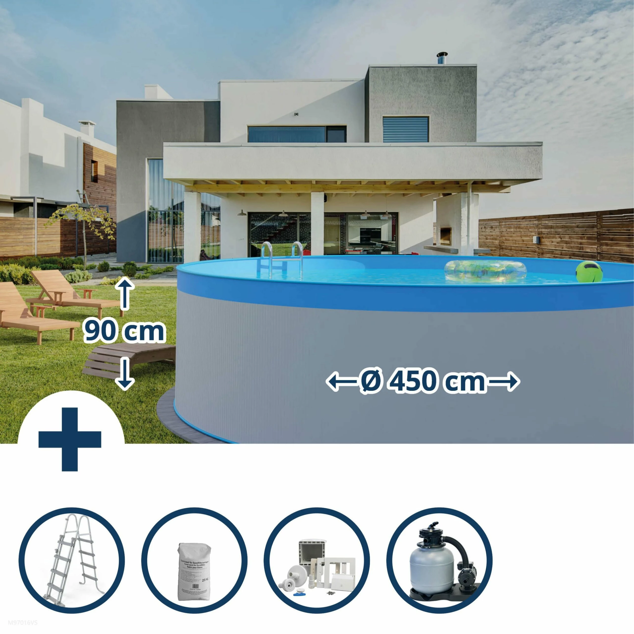 Dieser Rundformpool hat die Maße 450 x 90 cm und die Außenfarbe weiß.