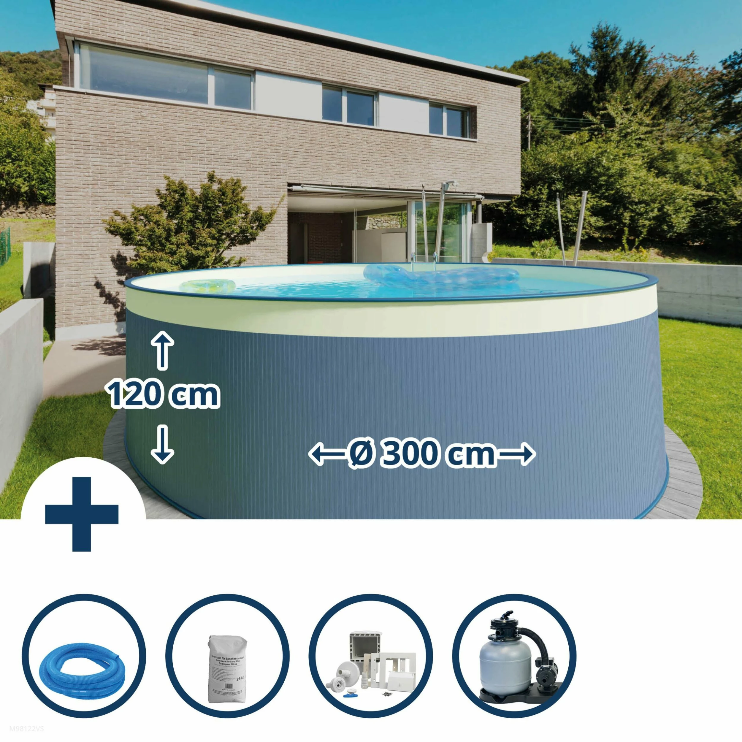 Dieser Rundformpool hat die Maße 300 x 120 cm und die Außenfarbe anthrazit.