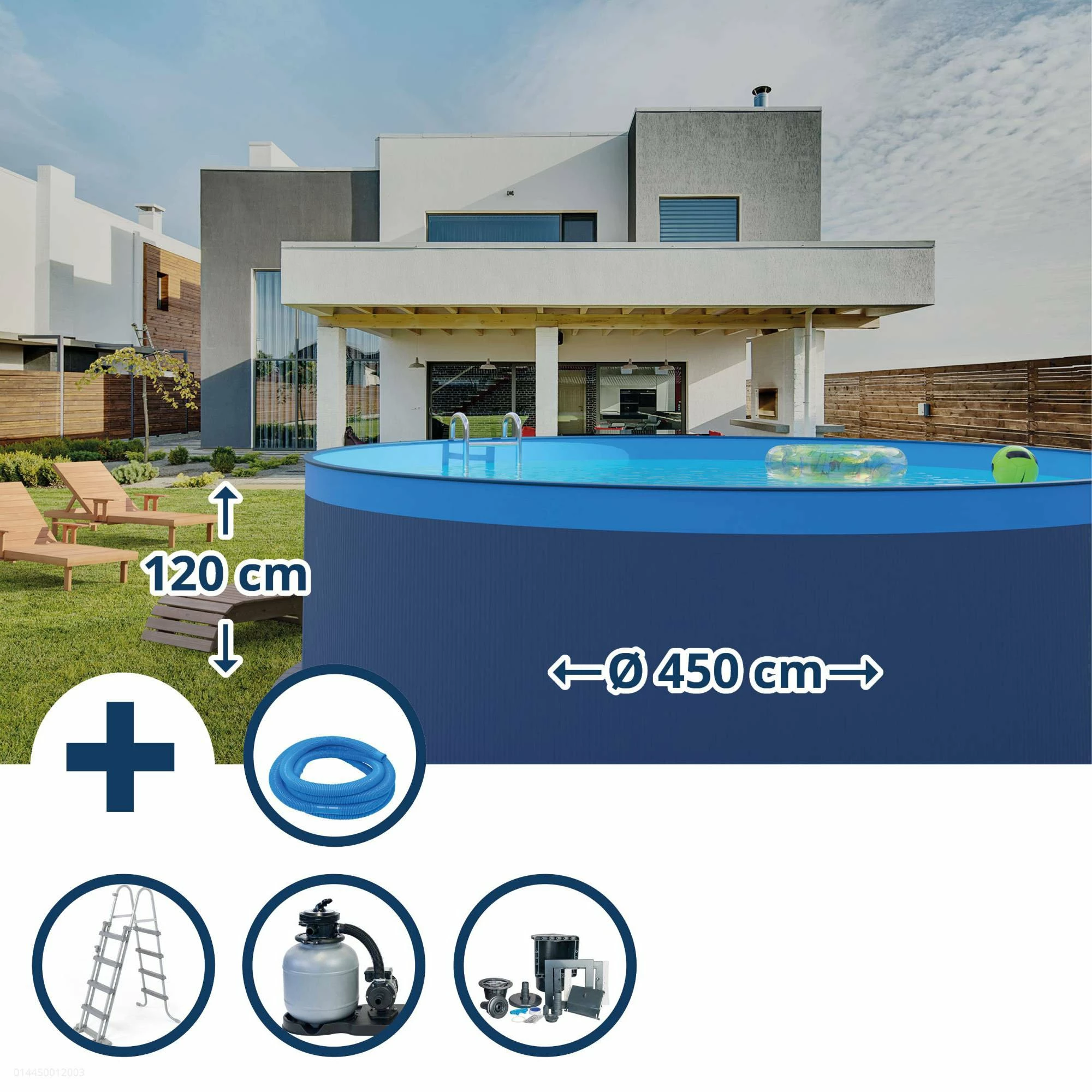 Dieser Rundformpool hat die Maße 450×120 cm und die Außenfarbe anthrazit.