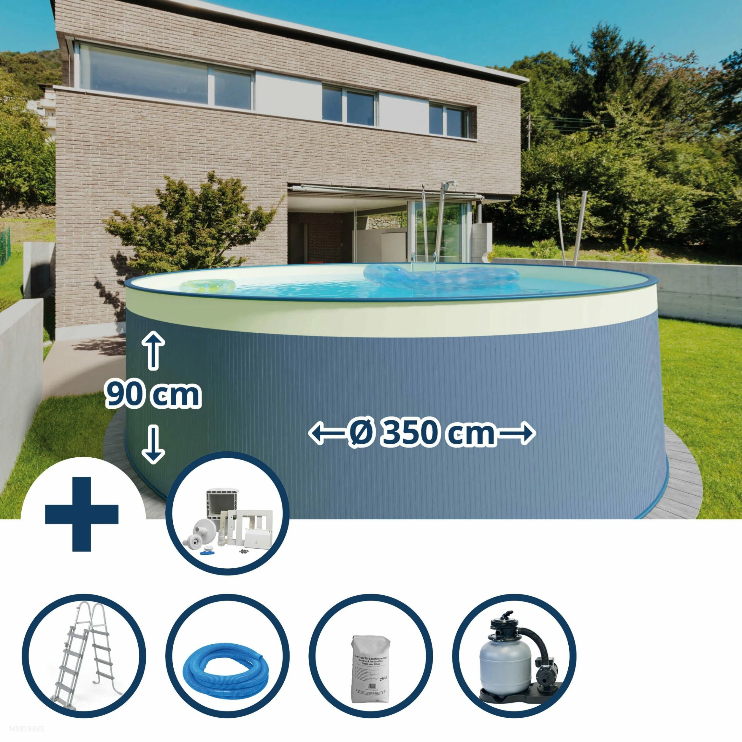 Dieser Rundformpool hat die Maße 350 x 90 cm und die Außenfarbe anthrazit.