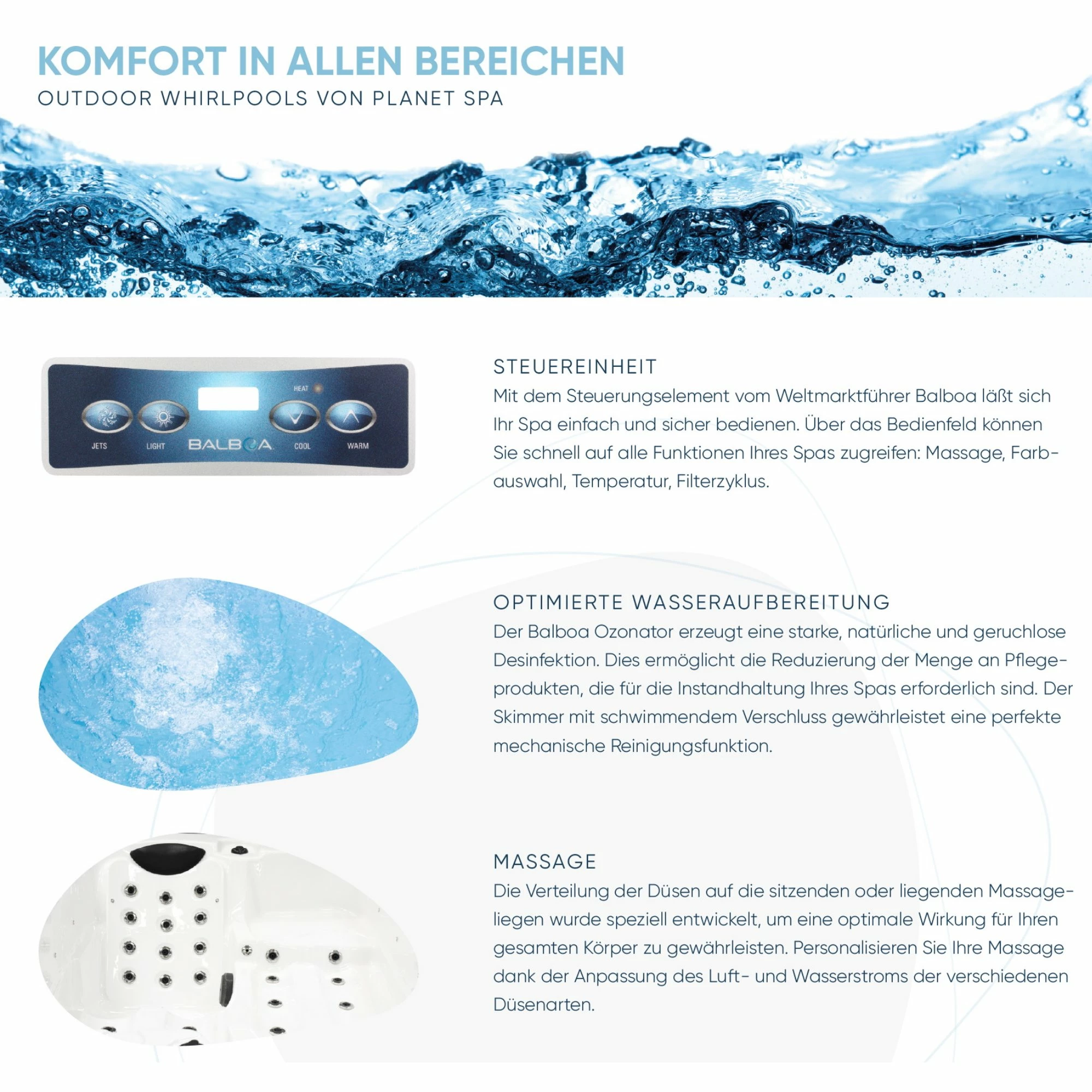 Mit dem Steuerungselement vom Marktführer “Balboa” läßt sich dein Spa einfach und sicher bedienen. Über das Bedienfeld kannst du schnell auf alle Funktionen des Spas zugreifen: Massage, Farbauswahl, Temperatur und Filterzyklus.